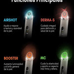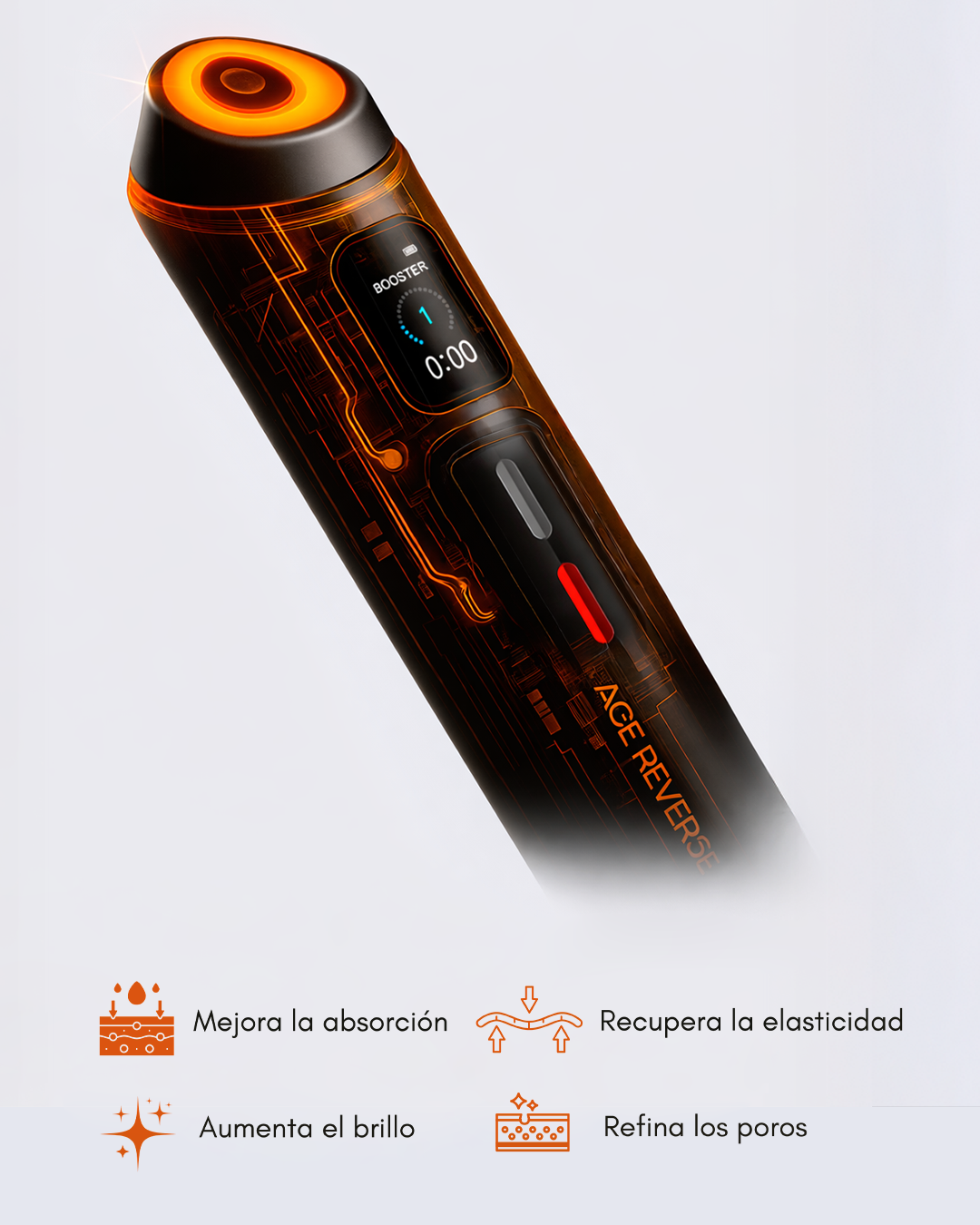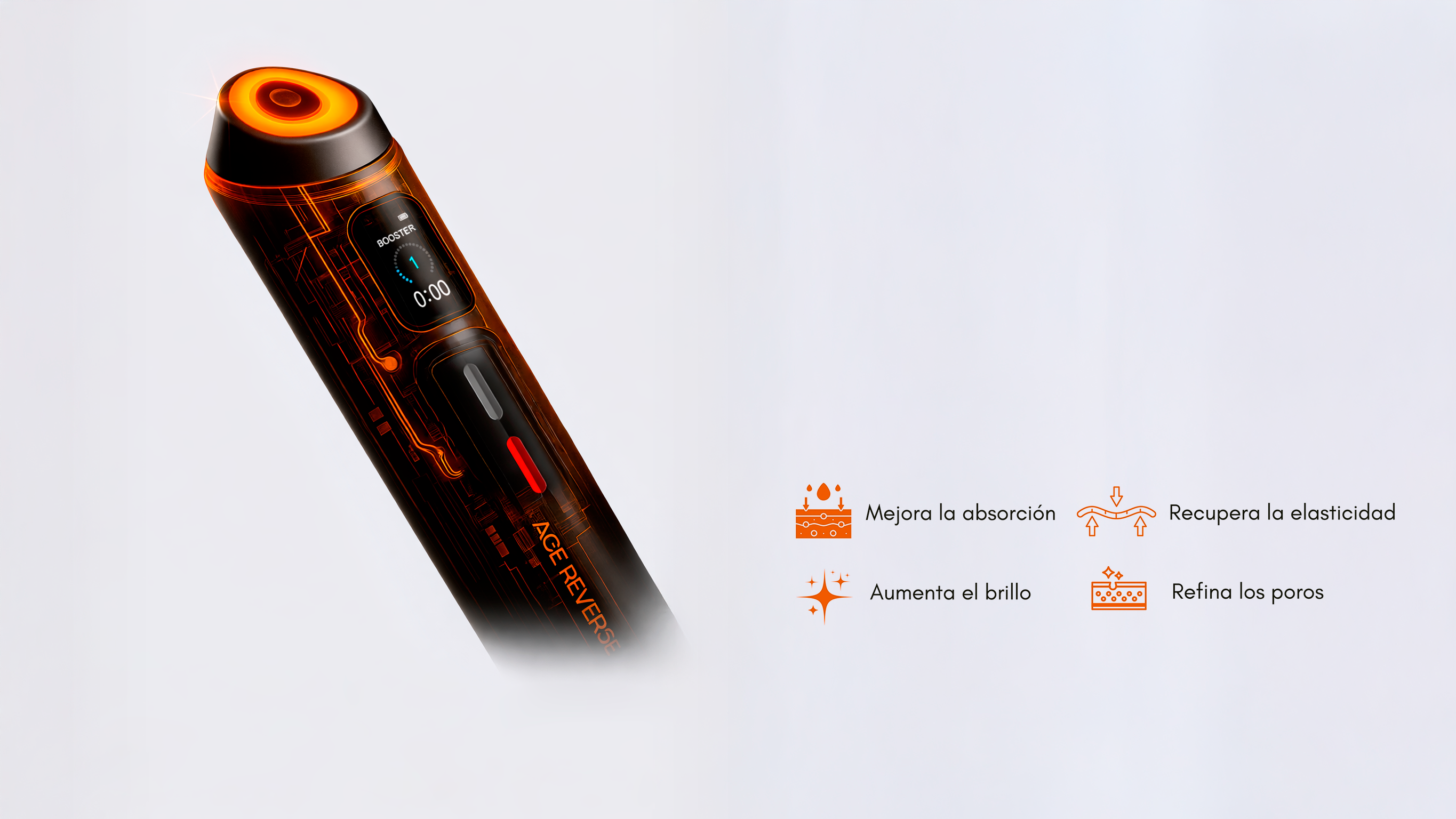 El modo Booster mejora la absorción de los ingredientes activos. Permite que los activos del skincare se apliquen de manera más efectiva, ayudando a potenciar el brillo general y la vitalidad de la piel.
